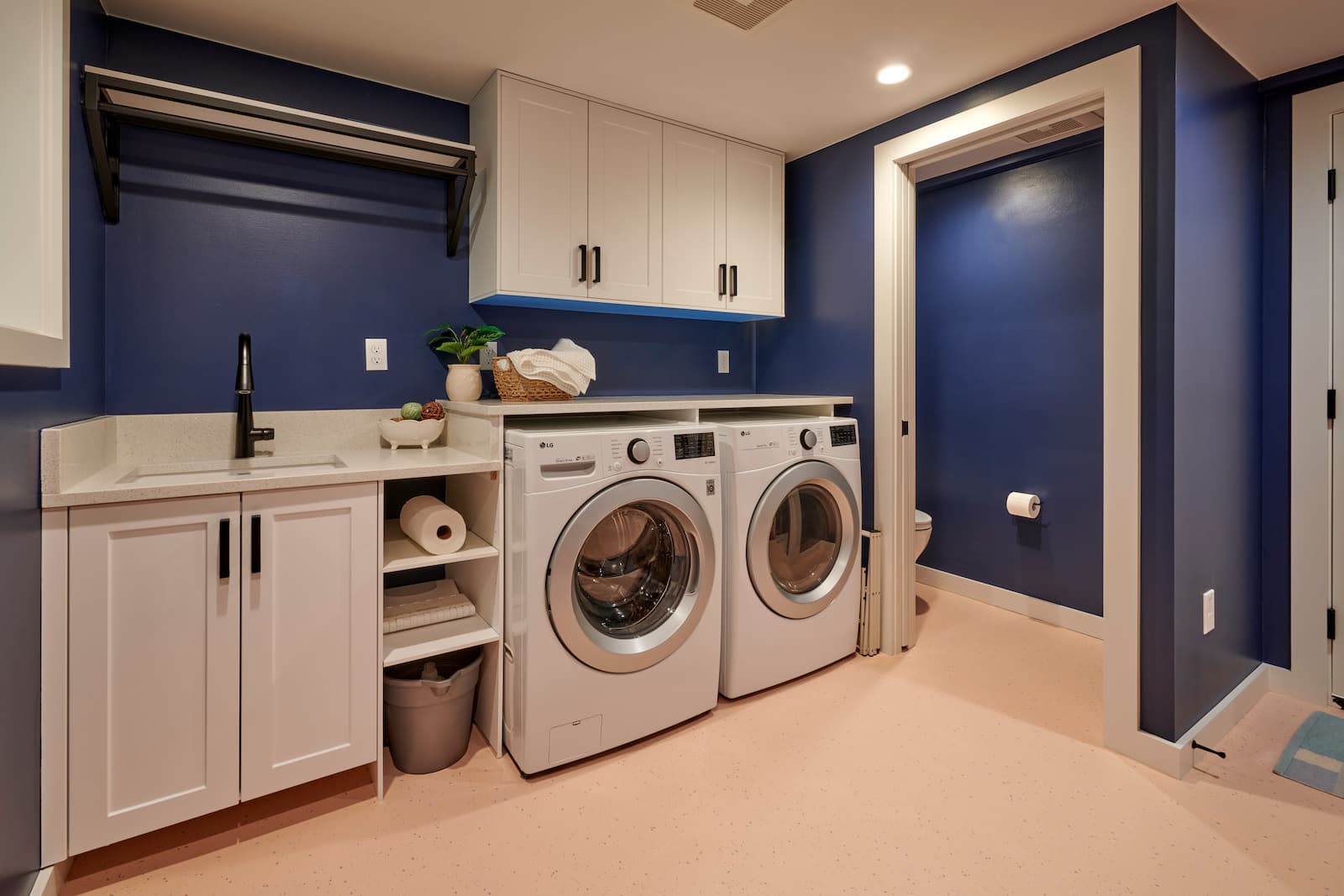 Mudroom & Laundry: Combine these functions if possible, as they complement each other well. Install cabinets and a countertop for folding and sorting clothes. A great example of this is on our portfolio, Mountlake Terrace Primary Bathroom/Spa and Laundry Room. This laundry room combines a mudroom, storage, pantry, and laundry all in to one area.