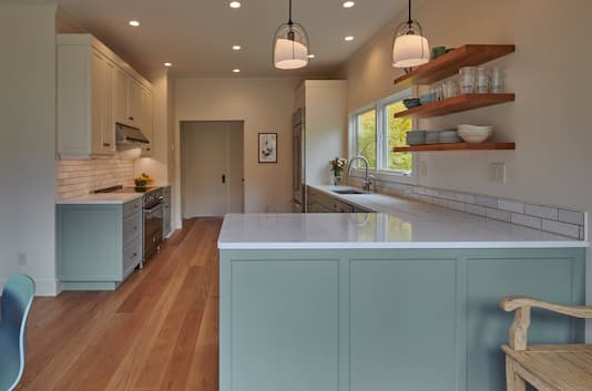Sometimes transforming a single, outdated room can make a home feel complete. Our clients' kitchen had served them well as they raised their kids, and the layout worked fine, but the materials were outdated and didn't match the home's original charm. Now that the kids had started their own families, the time had come for our clients to redesign the space for their own enjoyment. This full remodel project included structural upgrades, such as leveling the wonky floor and installing hydronic under-floor heating. The flooring itself was replaced with new engineered hardwood, and all cabinets, appliances, fixtures, and lighting are new. Even though the locations of the windows, doors, and appliances are unchanged, the gorgeous new space feels fresh and ready for this couple's next chapter.